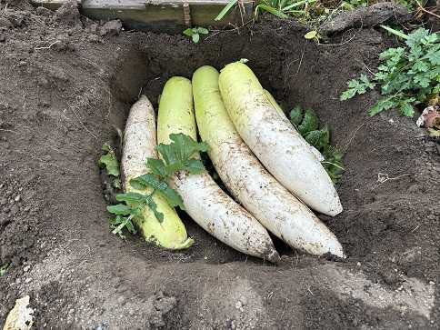今季は何時まで経っても暖かい日が続いていましたので、ダイコンが思いのほか生長し過ぎています。そこでダイコンを抜いて土の中に埋めてしまいました。抜いてしまえばある程度生長も止まりますし、真冬の気温が下がった日に収穫をして割れる心配もなくなります。