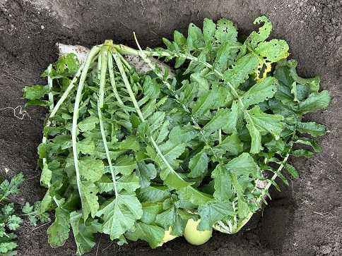 穴の中に切り取った葉を敷きダイコンを寝かせて、上から更に葉を被せています。