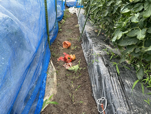 そして、カラス対策が完璧なはずのトマトが、またやられてしまいました。( ノД`)シクシク…まだ一個しか収穫できていないのに、カラスの方が私よりもトマトを食べており、カラスのために作っているようなものです。