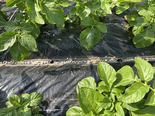 こちらは溝がないので根元へ追肥しています。後はマルチの切れ目にジャガイモが緑化しないように土を盛るだけです。