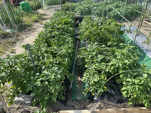 こちらの畝は種イモを植付けた通常栽培の畝で、右側がレッドムーン、左側がインカのめざめになります。