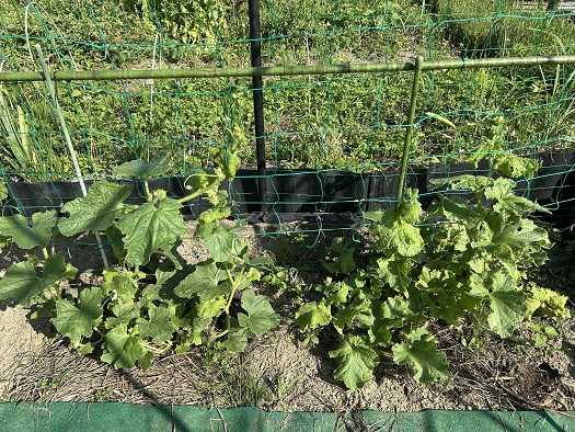 今年は昨年同様、蔓物はスイカにメロン、ゴーヤを作っていますが、特にスイカの生長が著しいです。メロンは、ウリハムシの被害に遭って生長はイマイチ、ゴーヤは、まずまず順調かな。