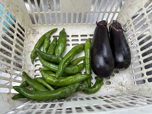 久し振りにナスビの収穫を行いました。収穫と言っても2本だけですけど。それに韓国産唐辛子を少々。