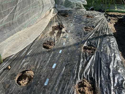 マルチに30センチ間隔で植え付け用の穴を8か所開けています。