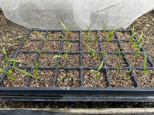 トレイ蒔きをしたホウレン草も無事に出そろっています。本葉が出た頃に畑へと移植します。