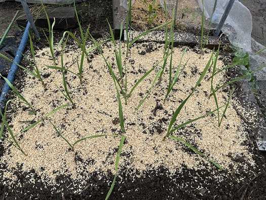 20株のニンニクを植付けています。何時ものように防寒と泥はね防止のため、もみ殻を敷き詰めておきました。