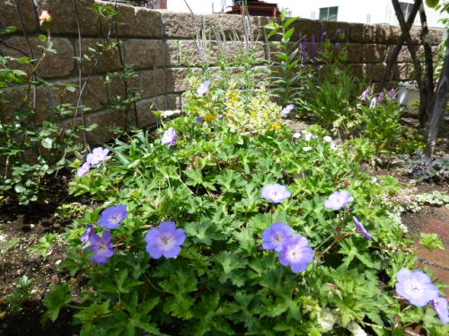 今日はいい天気カラドンナとなんだっけ?ヘンダーソニーだ!!ゲラニウム ロザンネイに遊びに来た蜂さん何蜂なんだろう