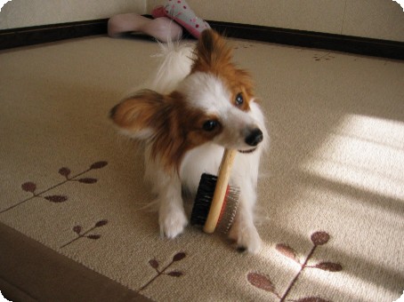 お外で散歩から帰ると、必ず「引っ付き虫」(草)をくっつけているブラッシングして落とさないとこうやってオモチャ化したブラシで気をそらしながら・・・いざ、ブラッシングタイム~ まて~~~