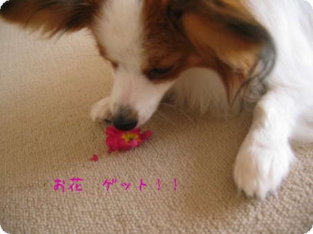 お花をもらいました。玄関先に植える前に、花とクリスを写真に収めようとしましたが・・・・・・・失敗です。お花とワルスの写真になりました・・・