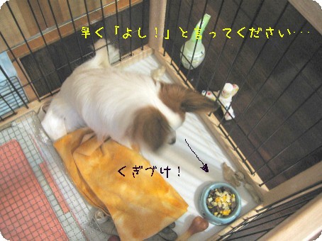 賢いワンコは何十種類もの指示語を覚えて飼い主さんに従っているみたいですが・・・さて、クリスはどうなんだろう。どれだけ覚えてくれるでしょうかとりあえず、毎朝ごはんの時に「まて!」を教えました。クリスは「まて!」はすぐ理解したようなのですが、解除の「よし!」がいまいち分かりづらいようでした でも今は、やっと分かったようです「よし!」で、すぐ、ガッツクようになりましたしか~し、ご飯の時だけ「まて!」が出来ているのではと心配しまして・・・「まて!」の意味が本当に分かっているのだろうか一刻も早くサークルの外に出たい時にも「まて!」出来るかなお~っ Open the doorでも我慢できてますよ~~もうちょっと、「まて!」ですよ~~結構長く「まて!」が出来ましたね~~カンド~です親バカ 「よし!」すごいダッシュで飛び出してきました外でもこんな風に「まて!」が出来ると安心して連れ出せるんですけどねがんばろうね クリストファー