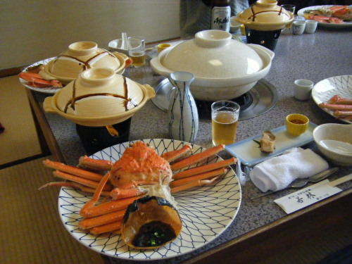 雪、ふりますなぁ。今日は、読書会で、蟹三昧の日。だが。朝から、というか、昨日から、雪。向かうは、鳥取、賀露港。安来を過ぎたあたりから、だんだん、雪が多くなり。海岸沿いは、多少少ないが、峠や鳥取市内は、やっぱ、雪が多かったです。車道には、雪がないけれど、歩道や、路地は、40~50センチは、ありそうでした。蟹三昧のコースは、カニ刺しつき¥9600のコースつきだし 2品焼きガニ・カニ刺し・ゆでガニ・カニみそ焼き・カニすき・雑炊まで。た~っぷり、旬の蟹を堪能しました。おいしかったです~~茹でカニも、大きな松葉がにと、若松葉カニがついていて、松葉ガニは、カニみそもた~っぷり。かにの甲羅に熱燗で、お酒も堪能。これは、カニ刺しです。2本あったけど、一本は、すでに、おなかのなかでした。。。これで、9600円は、(飲み物は、別だけど)お得と思う!!三昧のおかげで、食べ過ぎて、苦しいです。今夜は、さすがに、かに、欲しくありません。