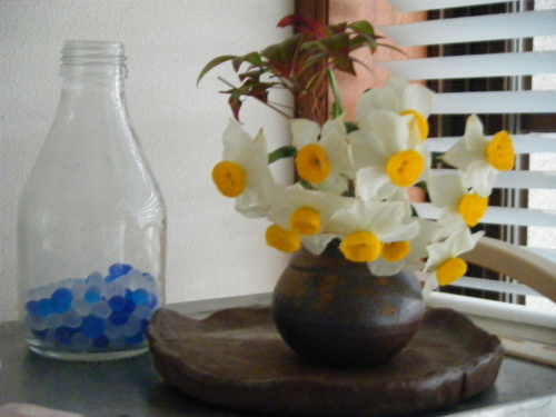 長男が岡山県でお世話になったはおかげ かどうかは定かではないけれど。備前焼、いいよね~~陶芸のなんたるか、なんて、ちっともわからないんだけど。この間行ってみた専門店でも「うわぐすりは、一切つかいません。器の色は、土を焼いて出るいろで、ひとつとして同じものは、ありません。」と言われたけれど、ほんと、そうなんだよね~形は、同じでも、手に取ると、色とか、全然ちがうので。自分だけの、って感じが、いいんだと思う。なので、買ってみた。一輪挿し用のツボ。1個1000円也。 スイセンとオタフクナンテンを活けてみた。下の皿は、長男が作った陶芸作品で、備前焼では、ないんだけど。結構、マッチしてたりする。生活の中に、お花があったりすると、やっぱ、和むよね~~