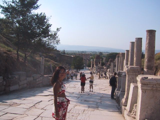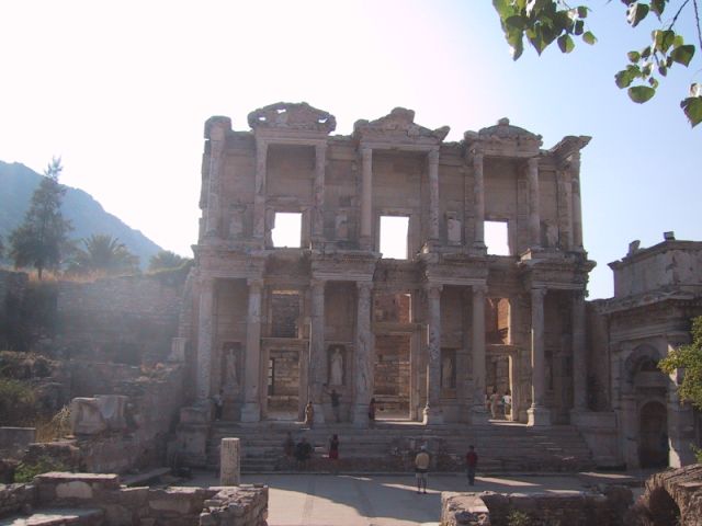 クシャダスの街を拠点に、一日がかりでパムッカレとエフェソス遺跡をまわりました。写真は有名な「セルスス図書館」。エジプトのアレキサンドリア、そして同じトルコの国内にある、コチラもそのうちに紹介したいと思います、ベルガモンと並んで古代史に残る世界3大図書館としてその名を知られています。このセルスス図書館にはおよそ12万冊もの蔵書があったといいます。。。(スゴイ!)エフェソス、という街自体は紀元前11世紀までさかのぼるそうですから、なんだか想像も出来ない程(!)ですが、ギリシャ神話の神々がまだ生き生きとあがめられていた時代の名残りがあちこちに残っています。以前も紹介しました、エフェソスの大劇場。約2万4千人を収容するという大劇場では現代でも時々オペラやお芝居を上演するそうです。ヴェローナのアリーナでも、真夏のオペラを上演したりしますが、こういう悠久の時代を生き延びてきた劇場で催されるひとときはきっと、とってもステキなんでしょうネ。ちなみにエフェスで催されるお芝居は、観客もみんな、古代の衣装を身につけてあつまるのだそうです。なんだか幻想的ですよね!ぜひ見てみたいものデス。山の斜面をそのまま利用して、すり鉢型の劇場にしてしまうとはなかなかのアイデアです。舞台の床は大理石が敷き詰められています。。。。で、この舞台上で発した声は最上段の席まできちんと届くんです、フツウの声でも。ちゃんと音響のことまで計算していたのかしら???劇場の観客席から、大理石で舗装された、昔の大通りを眺めます。ガイドブックには、この通りは「海岸通り」と記されています。トルコのいいところは、こういう遺跡の周りが手付かずの状態で保存されていること。高層ビルも、工場も見えない緑の山や大地を眺めていると、まるでタイムスリップしたような気分になれるのです。。。図書館の入り口で。円柱に飾られた入り口には学問の女神像が立っています。内部は長い年月の間に屋根も壁も失い、レンガを積んだ壁のあとや、床の石の隙間からは背の高い雑草が伸びていました。それでも、なんだか神聖な空気は残っている気がして、思わず息をひそめてたたずんでしまいます。・・・風が草を撫でる音が、数千年前の美しい図書館を、ページを繰る音をよみがえらせてくれるようでした・・・。図書館入り口の彫刻を見上げて。・・・空の青さが切ないくらいデス。。。・・・エフェソス遺跡の魅力はまだまだ続きます。。