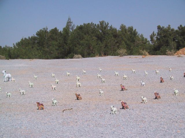 道端で売られている、ラクダやヒツジのぬいぐるみ達。・・・いくら土地が広いからって、こんなのってアリ?・・・思わず「いや~ん、カワイイッ!」って気をとられちゃいますヨネ。このほかにも、こういうぬいぐるみを大きいのから小さいのまで、順番にヒモで繋げて並べてみたりと、いろいろなディスプレイ(?)で客を誘っています。ぬいぐるみのほかにも、トルコでは牛や馬、ロバからヤギ、ヒツジ、亀にいたるまで、たくさんの動物達に出会います。ココは、イズミル郊外の幹線道路沿いにあるレストラン。ドライブイン、といったほうがいいのかしら。。自宅周辺で畑をしているので、新鮮な野菜をつかった郷土料理が食べられます。庭にテーブルを並べ、木にはハンモックを吊るして長距離ドライブをしてきた旅人やドライバー達を癒してくれるのです。。・・・シチメンチョウも、います(笑)。アップでみるとカナリ怖いデス。。。ヒヨコはかわいいのにネ。。お水。左はナチュラーレ、右がフリッツァンテ。トルコでもやっぱり、ガス入りの水を飲んでしまいます。そういえば、「水」をトルコ語で言うと、「su」となります。「水なのに、酢~!?」って覚えます。。。(笑)。