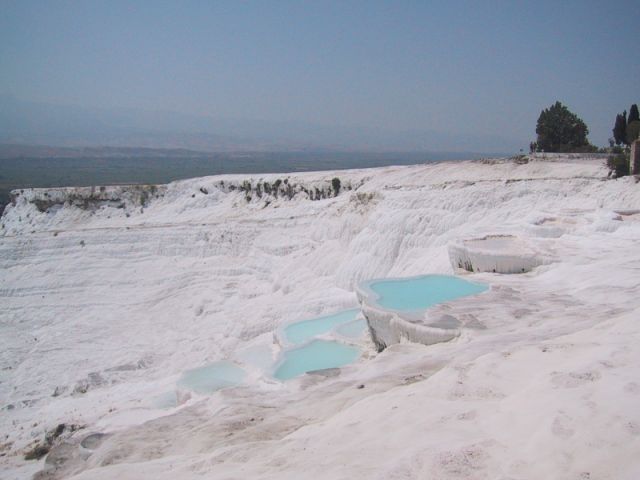 いよいよパムッカレですよ~!トルコ語で「綿の城」という意味の世界遺産。あまりにも有名ですネクシャダスから車でおよそ3時間くらい、平原をドライブしてやってきました。広大な大地に、突然真っ白な山。あちこちから湧き出している温泉と、この真っ白な世界は昔から世界の7不思議に数えられているとか。ココに行くときは、ぜひ水着とサングラスを忘れないようにしてクダサイネ。日光が真っ白な岩肌を反射して眩しいのと、せっかく天然温泉が湧き出しているのですから、楽しまないと!!パムッカレの岩棚は土足厳禁。皆さん靴を脱ぎ、素足で歩きます。石灰岩でできた岩棚は温泉に洗われて非常に滑らか。・・・かといってツルツル滑りやすくもなく、常に暖かい温泉水が流れていて、歩いているだけでもとってもキモチいいのです。でも、せっかくだから温泉のプールにも入らないと、ネ。。温泉プールは天然の岩棚なので、深さもイロイロありますが、人が入れるのはこうした浅いトコロのみなので、小さな子供から大人まで楽しめます。世界遺産の岩棚は近年温泉が涸れてきた、とか石灰の部分が観光客によって汚れたとかいわれて一時は入ることも出来なかったそうです。自然が作ったものは私たちの命と同じ、限りある大切なもの。。人の手で守れるのであれば、大切にまもっていきたいですね。ここは古代ローマ時代に大都市として栄えたトコロ。温泉の岩棚のすぐ近くには、ヒエラポリスという当時の遺跡が残っています。大劇場、古代の公共浴場、墓地や住居跡がかなり広い範囲で発掘調査されています。トルコの重要な文化財などの多くがここから出土しています。イタリアでもそうでしたが、トルコのこうした遺跡でも、ビックリするのは道がきちんと「舗装」されていること。ヒエラポリスでも、大理石が敷き詰められています。良く見ると、石の表面には溝が刻まれているものが多く、革のサンダルで滑らないように考えているのかしら、なんて感心してしまったんですケド、どうなんでしょ?それから、大通りには荷車が通ったのでしょうか、わだちのようなくぼみも見られたりします。古代の日常風景がふと、頭をよぎったりしちゃいますネ。劇場や浴場といった「生」のエリアから、少し離れたところに、「死者の町」、ネクロポリスがあります。2000年以上前の人々が眠る街は、見渡す限りの墓地。石造りで簡素なものから、きっと権力者のものであろう、精緻な彫刻のほどこされた大きなものまで。。。じりじりと、刺すような日差しの下、そこだけがシン、と静まり返って、いかにも「死者の町」といった雰囲気でした。古代の人が刻んだ墓碑。2000年以上の時を経てなお、ハッキリと残されたメッセージを見るとフシギと厳かなキモチになります。このほか、ヒエラポリスの遺跡から出土した古代の遺構のなかに温泉を引いて、プールにしてしまった「パムッカレ・テルメ」という施設もあります。以前の日記でもちょっと触れましたが、ローマ時代の円柱が横たわるプールで、その円柱や礎石に腰掛けて温泉に浸かれるのでこちらもオススメです。。以前の日記はこちら→http://plaza.rakuten.co.jp/ciaochie/diary/200608300004/