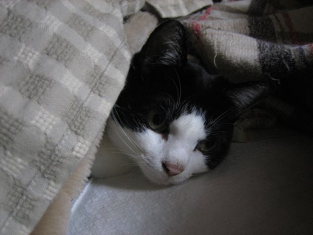 。。。こんにちは、みくです。 今日もお布団から失礼しマス。この名前はネ、まだあたしが赤ちゃんで、銀座の路地裏で震えていたときに、はじめてスィニョーラと目が合った瞬間、自然に呼ばれていたのヨ。「みくちゃん!」って。。。 なんだか気持ちイイ名前だと思ったからアタシも、「うにゃ~ん」って答えたの。そうしてアタシは、ここのウチのコになったのデス。・・・「みく」というのはネ、「未来」って書くんだそうです。エヘッ、ステキでしょう?でもね、スィニョーラはあたしのこと、色んな名前で呼ぶの。「富士額(フジビタイ)ちゃん」とか、「ちびっこの毛玉ちゃん」とか、「ちいさなタカラモノちゃん」とか。。。もちろん、「みくちゃん!」「みくぽん」 「みくのすけ」なぁんても呼ばれるけど。。。こんなポーズでいると必ずといっていいくらい、「ウチのセクシー・ダイナマイツちゃん!」なんて言うのよ。・・・悩殺・・・?まぁ、あたしにとってはなんて呼ばれても、スィニョーラがあたしのこと呼んでいるんだ、ってわかるから、適当にあしらっているってワケ。最近のお気に入りの呼び名は「ふわふわの綿菓子ちゃん」とか「ピッコリーナ」。「ピッコラ・ドルチェ」っていうのも気に入ったわ。これからも色んな名前で呼ばれるの、じつはちょっぴり楽しみなの♪・・・ん?なにコレ?・・・なんだかソソル匂いがするワ。ああっこの匂い!・・・マタタビだわっ どうしよう、カメラの前なのに・・・・。でも、やっぱり猫の本能がっっ!・・・うひょ~~~、タマラナイわ~。お兄ちゃん「・・・なんだ、アレ?まるで般若だな、・・・ったく」・・・では今日はみくちゃんを「ハンニャちゃん」って呼ぼうかしら(笑)。。。むか~し、小学生くらいのころ、「大草原の小さな家」っていうアメリカのドラマが大好きで、原作を全作、むさぼるように読みあさっていた時代がありました(笑)。その物語の中で、主人公ローラのお父さんが、娘たちを「アップルパイちゃん」とか「こねこちゃん」なんて呼ぶのにとってもあこがれていました。で、みくのことを試しに「ちびっこちゃん」なんて呼んだりしたら、次から次へ、あだ名ができてしまいました(笑)。自分が好きなモノ、気持ちのいいもの、美味しいもの(?)に例えて呼ぶとなんだかますます愛しく思えます。。。その調子で、会社でもときどき、「ねぇねぇ、ウチの「小さくてやわらかくてあったかい生き物」ちゃんがね、。。。」などと言ってしまうことがあります。。。ええ、ただの親ばかです、スミマセン~~