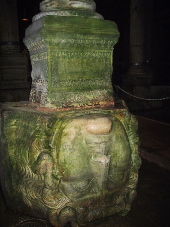 ここは、スルタンアフメット地区、トプカプ宮殿からブルーモスクにかけての地下。はるか昔に作られた、地下貯水池です。その昔は魚なども放されて、単なる貯水池というよりも、地下宮殿、といった趣があったのだと思います。写真は、この貯水池の奥にある、「メドゥーサの首」。メドゥーサの首を礎石に地下宮殿を作り、権力の象徴としたのでしょうか?。。。でも、マトモに見ると石になっちゃう、という伝説を恐れてか、逆さに据えてあるあたりが妙になまなましかったりして(笑)。現代では、この空間を利用して、ファッションショウや、コンサートといったイヴェントが催されることも多く、私が行ったときもちょうどファッションショウの準備で照明がテストされ、仮設のランウェイなども作ってあったりしました。・・・暗くて見づらいですネ。。よく見ると、柱の一つ一つに、こうした彫刻が施されているのでした。・・・不思議なトルコの1シーンです。さて、イスタンブルで朝食にいただいたのがコレ。・・・この白いのは「カイマック」といって、生クリームのようなものです。ガラスのお皿には蜂蜜が入っていて、カイマックと一緒にパンに塗ったりして食べます。カイマック、というのは「牛乳の膜」というような意味なんだそうです。食感はクリームというよりもカッテージチーズのようにしっかりしていて、でも口に入れるとふわっと溶けます。牛乳本来の味なので、こうして蜂蜜などで味をととのえるのですネ。・・・ケーキなどにも付け合せで添えられることもあります。けっこう濃蜜な味わいなので、少しでも断然、元気になります(笑)。ちなみにコチラは、トルコでの最後の夜にいただいた食事デス(笑)。なんだか長距離ドライブが続き、いよいよ最終日ということでどっと、疲れが出たんでしょうね。二人とも、あえて外に行く元気なし!ホテルのルームサーヴィスで、サラダとパスタを注文。。。結局、イタリアンです(アハッ☆)。。でも、デザートにはちゃっかり、ヴァクラヴァをもらいました。写真の奥のほう、パンの籠の向こうにあるのがヴァクラヴァ。ここのヴァクラヴァは、生地を葉巻のように巻いて、ピスタチオをくるんであります。・・・で、このヴァクラヴァのお皿にも、中央にカイマックが添えられていました。はう、食べたいなぁ~~~。。。