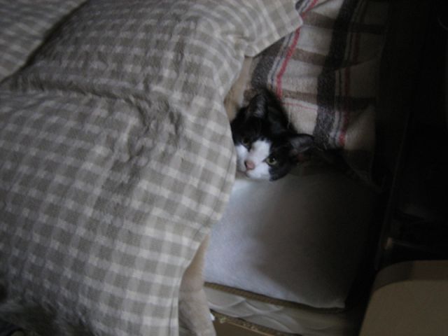 こんにちは、みくです。毎日寒いですネ。お布団はキモチいいです。起きた後はこうしてストーヴの前が指定席。・・・お兄ちゃんとはつかず離れずの距離を保っていることにしているの。・・・え?お兄ちゃんの顔、見たいですか?お兄ちゃんデス。今年で18歳になります。・・・老人?でも、まだまだ元気。こうしてみると、なんだか知的な(?)横顔。・・・肉球、好きですか?