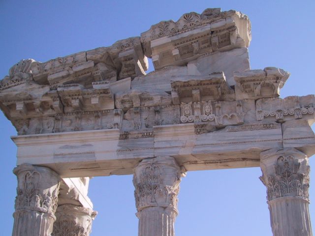 ・・・久しぶり、トルコのおハナシ。前回はエフェソス遺跡を紹介し、世界でも3本指に入るというセルスス図書館などを見てきましたネ。今回は、そのセルススと肩をならべ、アレキサンドリアについで世界第2といわれた遺跡、ペルガモンに来ています。あのアレキサンダー大王の亡き後、その遺産と栄光を引き継いで誕生したのがペルガモン王国。どんな大きな都市なのか、と期待して行くと意外にも小ぢんまりとした遺跡。。小高い丘の上に創られた白亜の王国は、西アナトリアの大地を見渡せる絶景の都でした。ココが、アレキサンドリアに次ぐといわれた図書館の跡。今では風が吹き抜ける廃墟ですが、白く輝く大理石の柱が、その威容を今に伝えます。トラヤヌス神殿。一番上の写真の彫刻があったファザードです。私が行ったときは、回りに観光客もあまりいなくて、ひっそりと、ただただ、時の流れを感じるようなひとときでした。。。空が青いなぁ。。。エフェソス遺跡に比べると、あんまり保存状態はよくなかったです。・・・でも、見学料は高かった(笑)。立地的に、有名な遺跡の割にはなかなか観光客も来ないんでしょうか。。。現在はちいさな町が、この遺跡の麓に細々とした暮らしを営んでいます。麓の町からは、車でくねくねとした山道を登らなくてはいけません。でも、ここからの眺めはまた、絶景なのです。・・・有名な大劇場。急斜面に作られた劇場は、土地の形状から、きれいな半円形にはできなかったようですが、斜面を利用した観客席は1万5千人を収容したとか。。高所恐怖症のヒトにはツライ劇場デス(笑)。実際に上から見下ろすとくらくらするくらいの急斜面。ちょっと足を滑らせたら大変なコトになりそう~~。それにしても、こんな高いところまで、あの大理石を運んじゃったんですヨネ。。。人間って、スゴイ。。。。