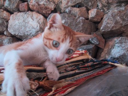 写真の子猫はお土産店の看板猫をつとめていた。・・・といっても商品の上でだらん