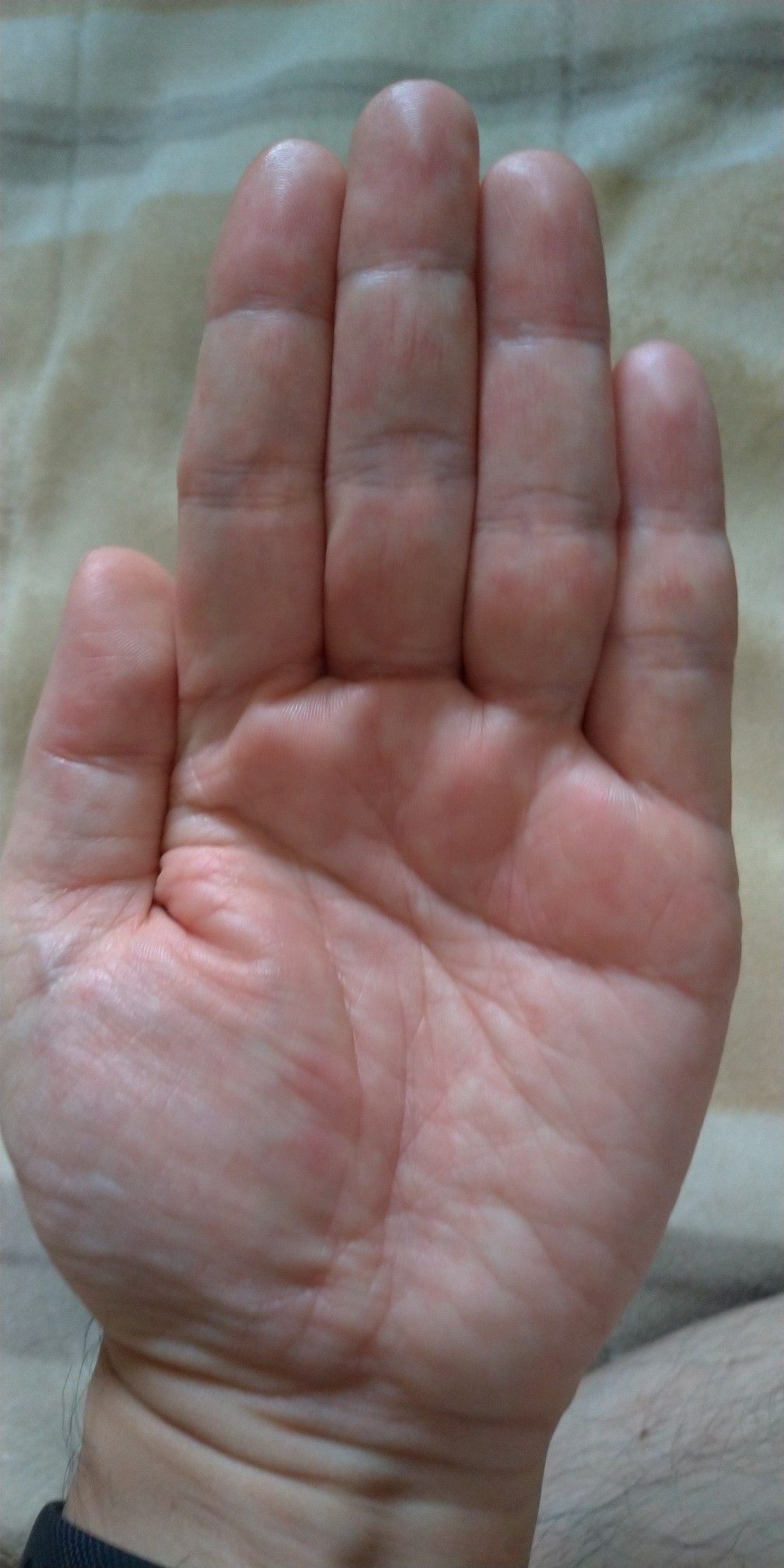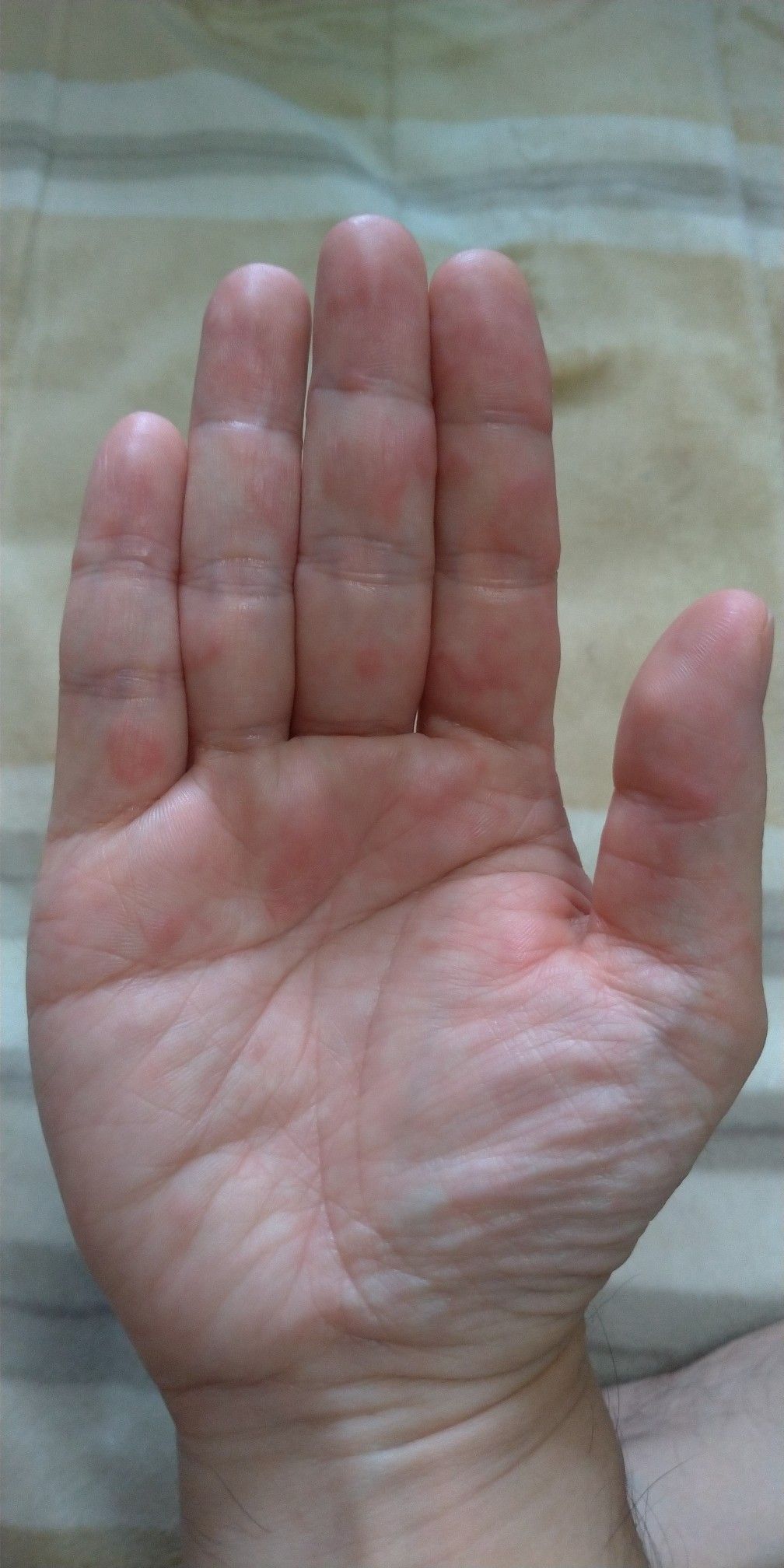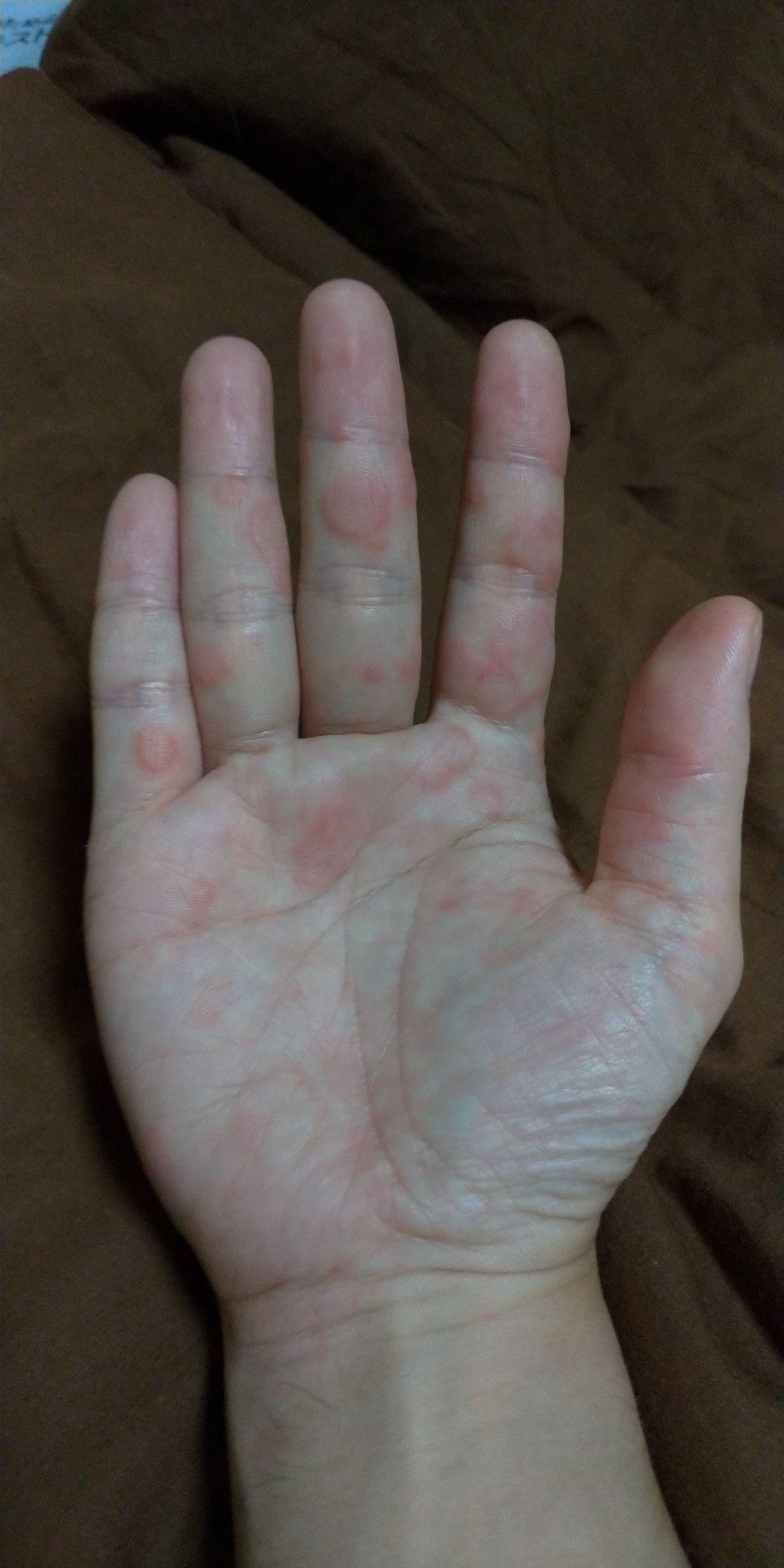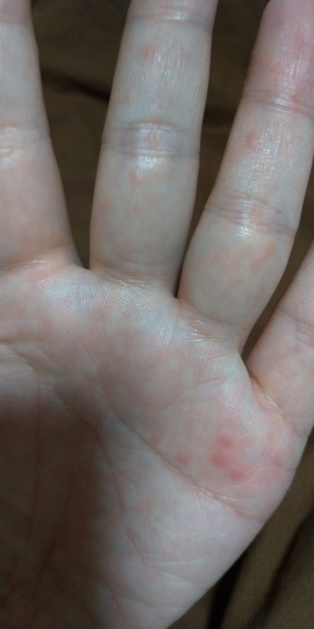 手のひらの腫れは昨日とあまり変わらないな。他の部位にも広がっていない。36.4℃