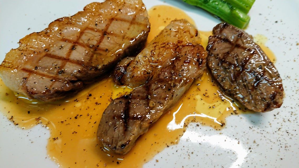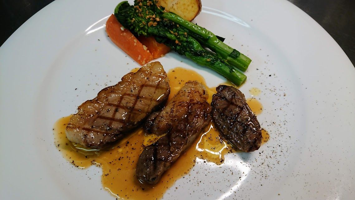 ミカンイノシシの背肉ロース(たまにヒレ)とバラ肉の低温ロースト後のサッとグリエ、