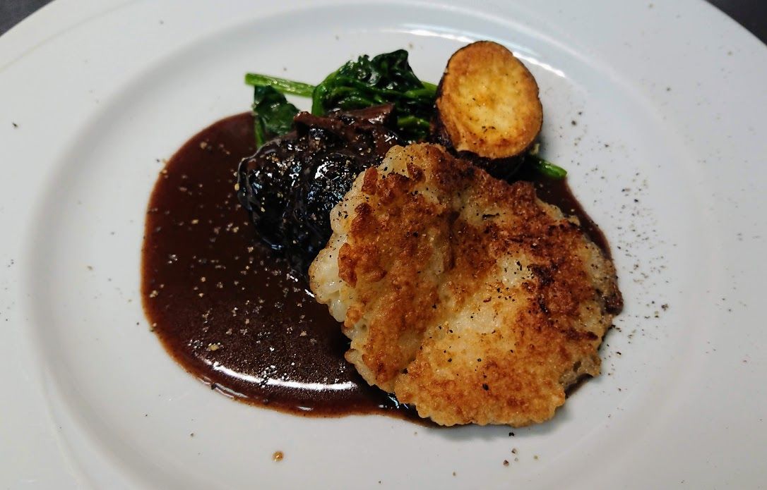 たっぷりの赤ワインとマデラ酒少しで煮込んだエゾ鹿肉に一度冷まして丸くしてから両面をカリッと焼いたパルミジャーノ風味のリゾットを添えてます。柔らかい肉とカリカリのリゾットが良い対比だと思います。