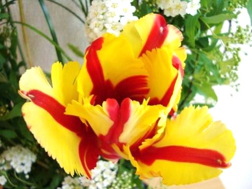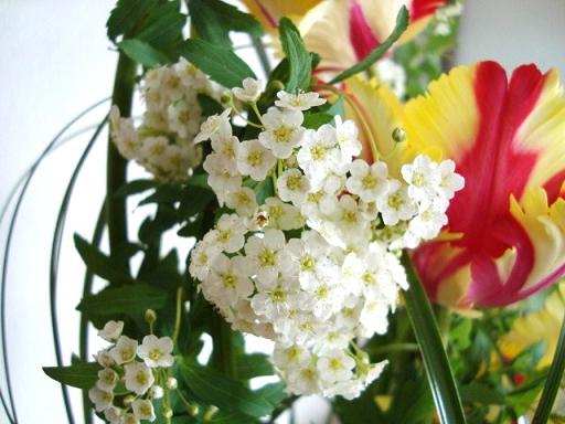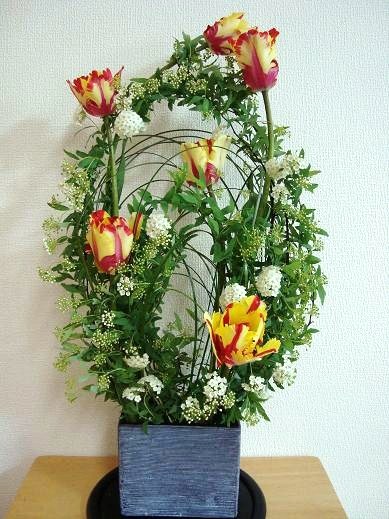 今回のアレンジにも使われたチューリップ、チューリップってどんなチューリップでも元気をくれますねそして、明るさや楽しさも~小さな子供がチューリップを好きなのは、同じ波長だからかもね (もう少しコデマリが咲いてから撮ったらよかったのですが・・・) お花は、自分が思った所に枝を曲げようとしたり、お花の向きをこっちにと思っても、なかなか思い通りにはなりません。お花は自然のものだからね。そのお花の向きや特性を生かし、お花に合わせて、一番きれいに見える位置を見つけて生ける。先生がいつもおっしゃいます。「人も同じよ~。相手を自分の思い通りにしようとしてもダメ」植物は全てそうですが、特にチューリップは太陽の光の方に顔を向けて伸びていきます。このチューリップも円に沿って丸くアレンジしていたのが、夕方にはまっすぐ気味に・・(苦笑)そして昼間の暖かい時は花びらが、これでもか~っと言うくらいまで開き(笑)、散るのかと思いきや、夜になるとちゃんとおさまります。なかなか思うような所に定着してくれません。 人も自然も思い通りにはいかない。 だから、柔軟な心も必要 また、その思い通りにいかない人や自然から、 思いやりや優しさ、恩恵をたくさんもらうこともあるね ありがとうの感謝の気持ちも必要 春は必ずやってくる