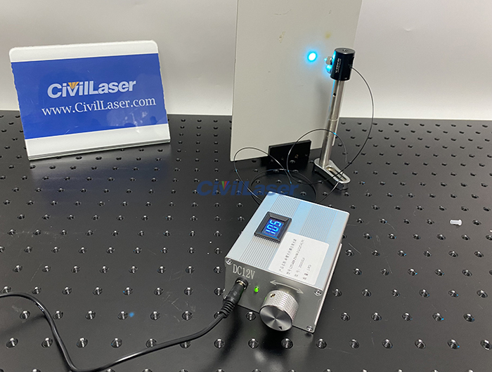 これは、ドライブ付きの 488nm 25mW ピグテールレーザーです。ドライブには、レーザー出力を調整するためのノブがあります。下の「DC 12V」インターフェイスは、電源に接続されています。ドライバーの表示画面に電流が表示されます。光ファイバーは壊れやすいアイテムなので、慎重に取り扱い、曲げないようにする必要があります。