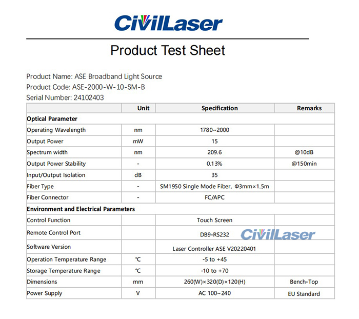 これは2000nm 10mW ASE ASEブロードバンド光源です。波長範囲は 1780nm ~ 2000nm です。シングルモード ファイバーを搭載しています。100 ~ 240V の広範囲の電圧に対応しています。これは電力調整不可能な ASE 光源であるため、レーザーのオン/オフ状態のみを制御できます。