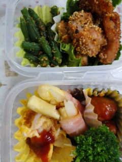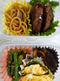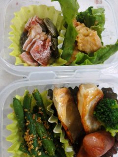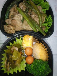 みしゃおが学校を休んでおります。わりと元気なんだけど、食べるとツライみたい。それでも食欲があるようで、ますますツライみたいで。今日は体育祭の予行演習なので、ムリさせると後々やっかいかなと。というわけで、今日はお弁当二つ。みしゃおが休みならちょっとゆっくり~なんて思ってたら、ゆっくりしすぎてバタバタしてしまった。まだまだ修行が足りません。豚肉といんげんの炒め物。味付けは焼肉のタレ。グリーンリーフ。ラタトゥイユ。昨日の夕食のおかず。アミエビ入り卵焼き。ウインナー。プリプリエビフライ。冷凍食品。ブロッコリー。ラタトゥイユ、ちょっとトマトが少なかったので、彩の「赤」にはならなかったな・・・