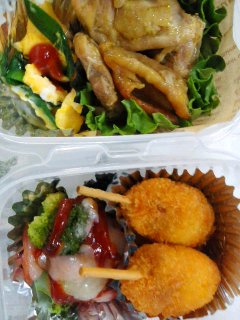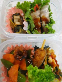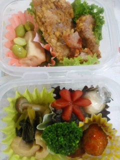 今日はそしゅけに起こされることがなかった。やれやれ。お天気が下り坂のようで・・・あ、もう降り出してきた。そしゅけ、うしゅけは既に学校に到着している時間だけど、パパとみしゃおはまだだな。どっちも最寄りの駅から少し歩かなきゃいけない。小松菜の煮浸し。昨日の夕食のおかず。グリーンリーフ。きんぴらの豚肉焼き。コープの加工品。フライパンで焼くだけ。とっても重宝してます。ピーマンの麺つゆ炒め。ピーマン、ちくわ、にんじんを油で炒めて麺つゆで味付け。先にちくわ、にんじんをフライパンに投入して他のことをしていたら、ちょっと焦がしちゃったミニ串とんかつ。冷凍食品。串のせいで1本しか入りません。ニラたま。ブロッコリー。9時すぎ、みしゃおの学校から電話。また胃痛で苦しんでいるとのこと。今日もお迎えに行ってきたよ・・・・その足で病院へ。胃腸がだいぶ弱っているらしい。お薬をもらって帰って来た。そういや、中学に入ってみしゃおの食生活って大きく変わった。小学校のころはおやつも「納豆ごはん」で、お菓子などめったに食べなかった。それが毎日放課後菓子パンなどを食べるようになって、胃腸もびっくりしてるのかもね。お昼、みしゃおは胃に負担をかけないよううどんにした。このお弁当は私のお腹の中に・・・・結構イケるやんか(自画自賛)