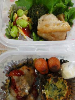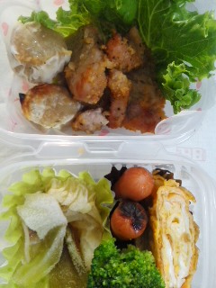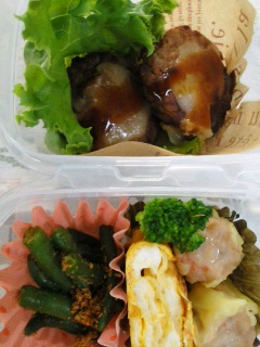 土曜日、日曜日とずっと出ずっぱりだった。なんとかお弁当の体裁を整える程度には買い物をしたけど。今週からほんとうにお弁当3つの日常に戻った。今日のみしゃお弁当。グリーンリーフ。チーズハンバーグ。ハンバーグがおかず容器の中を泳いでいる。他にいれるものがなかったの・・・いんげんの胡麻和え。アミエビ入り卵焼き。エビシュウマイ。伊丹空港の蓬莱で買ったエビシュウマイ。美味しいよブロッコリー。市販の冷凍食品も、自家製の冷凍保存もなくなっちゃったしね。肉も魚もあんまりないわ~。野菜やらなにやら買ってきて、ストックしておかねば。
