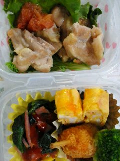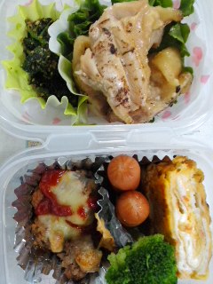 うしゅけ、薬持参ではあるけど、ほどほどに元気に出かけていった。やれやれだわ。ここんとこずっと、なにがどうかよくわからないけれどバタバタしている。みしゃおの学校、うしゅけの学校・・・いったい何回行ったっけ。買い物に行ってないわけじゃないのに、必要なものだけをちゃっちゃと買ってくる感じで、お弁当を作るのにも食材に一貫性がないっつうか、イマイチ献立に迷うというか。久々に今日は予定がないのだけど・・・・ゆっくり予定を立ててから買い物に行けるかな?本日のみしゃお弁当。グリーンリーフ。鶏肉とトマトのグリル。塩コショウして魚焼きグリルで焼いただけ。もともとのレシピは、ニンニク、ジャガイモも入っていてオーブンで焼くのだけど、どっちも無かったし。ほうれん草、コーン&ベーコン。ケチャップを添えて。これにチーズをのっけて焼くのもうちの定番。アミエビ入り卵焼き。うずら&ウインナー串。冷凍食品。みしゃおのリクエスト。ブロッコリー。