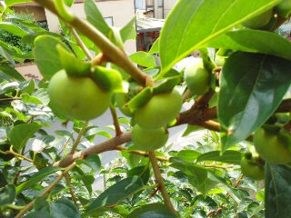 お昼前、うしゅけの担任の先生から電話があり、うしゅけギブアップ車で迎えに行った。保健室のある校舎は奥の方にあるので、そのまま車で学校の中に入って行って、その校舎前の駐車スペースに停めた。入ってすぐ給品部があり、そのとなりが保健室。中に入って、保健室の先生とお話して引き取ってきたのだが・・・ベッドから降りて上靴を履くうしゅけ。ママ、絶句。上靴が~、上靴が~真っ黒に汚れているくらいでは驚かない。想定の範囲内だ。何故だかやぶれていて、まるでスリッパのようになっている。「破れてちょうどよくなってん。」と、うしゅけ。「あんた、ええ加減にしぃやぁ。」あきれる私に先生、「みんな結構スゴイんですよ~。」と笑ってたけど、いや、なんかもう、怒る気も失せた。先生にお礼を言って保健室を出たあと、しんどいうしゅけを連れて給品部に行って、新しい上靴を買ったよさすが給品部の方は心得ていて、サイズ確認のため試着させてくれ、ペンを貸してくれ(靴に名前を書くため)、汚い上靴を処分してくれた。「男の子は特にね、ひどい状態で買いにきますよ~。」・・・そういや、前回買い替えたのは、底に穴が開いたからだったな。なんか泣けてきたようちの裏の柿。ベランダから写真を撮ってみた。うしゅけがお腹にいるころに苗を植えたから、かれこれ15年。ここ5年ほどたっぷり実をつけてくれる。写真では大きく見えるけど、まだ直径にして3センチってところ。このまま落ちないでいてくれるといいな。