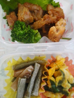 昨日、屋久島を観光したうしゅけ達。学校のHPの写真にうしゅけは見つけられなかったけど、楽しそうだ。そして美味しそうだ。屋久島杉を使ったクラフト体験もあったようで、うしゅけ大喜びでやってるかな、そうだといいな。今日は、縄文杉トレッキング。この時間、もう歩いているはず。屋久島のお天気はくもりになっていたけど、どうなのかなぁ。冷凍庫お掃除キャンペーンは、ほぼ完了。おかげで市販の冷凍食品も自家製冷凍食品もほとんどなくなった。ついでに冷蔵庫内の加工品などもなくなって、今日のお弁当の食材までなかった・・・・・貯金し過ぎて金欠みたいな気分だ・・・ちょっと違うかな?はい、今日のみしゃお弁当。ノンフライ鶏のから揚げ。「揚げずにからあげ」をもみ込んで魚焼きグリル。それにしても、うちのお弁当の鶏肉率の高さといったら・・・・大葉。ブロッコリー。いんげんとエリンギのおかか煮。冷凍保存していたのをそのまま。お弁当用ストック終了~ニラたま。もうこれしかなくて・・・。品数もいつもより少ないけど・・・唐揚げだから許してもらえるだろう