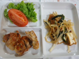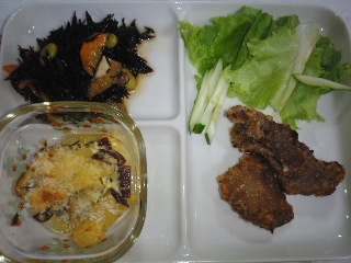 朝、パパから電話あり。大阪はとってもいい天気なのだけど、東京はくもり空だそうで。遠くにいるんだなと実感。今日はそしゅけが「パパは?」と言い出した。パパの不在に気づいたらしい。通じないとわかってはいるが、一応お仕事でしばらく帰ってこないと説明した。昨日は手の込んだ夕食を作らなかった。じゃ、今日は手の込んだものを作ったのかといえば。作らなかった。つ~か、普段から手の込んだものなんて作ったことがなかったな・・・私のお皿。写真、ちょっと暗い。くじらの竜田揚げ。コープ。油で揚げただけ。グリーンリーフ&きゅうり。さつまいものグラタン。お弁当でお馴染み。りんごジュースで煮たさつまいもにマヨネーズと粉チーズを和えて、パン粉、バターをのっけてオーブントースターで焼いた。ひじきの煮物。うす揚げ、にんじん、枝豆(冷凍)を加えて、数日前に作った手羽元のポン酢煮の煮汁でたいた。いつも通りの量を作って、半分は冷凍保存しておく。写真にはないけど、チンゲン菜、厚揚げ、エリンギのお味噌汁(玉ねぎ氷入り)ご飯(玄米&白米)納豆。くじらなんて久しぶりだな。給食に出ていた角煮は大好きだった。今日はコープで見つけた竜田揚げ。子供らにも好評でよかった。