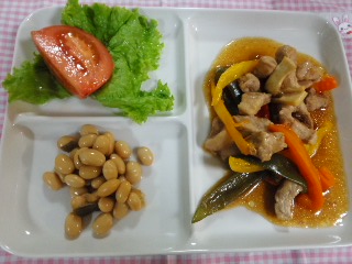 パパが東京に行って最初の週末。生活環境を向上させるべく、いろいろ買い込んでいる模様。なるべく物を増やしたくないとは言っても、最初はやっぱりアレコレいるよね。いっぱいになった冷凍庫の写真を送ってきた。16年ぶりくらいの自炊だけれど、食材を買いこんで冷凍保存しているらしい。意識して野菜を食べようとしているのが見て取れる。今度帰ってきたら、料理本を何冊か進呈するか、うん、そうしよう。昨晩のうちの夕食。私のお皿。青椒肉絲風。「風」なのは全部細切りじゃないから。味付けはそのまま青椒肉絲。竹の子のかわりにエリンギ使用。宮崎のカラーピーマンをたっぷり。大豆と昆布の柔らか煮。シンプルに水と薄口醤油だけで煮た。3分の2を冷凍保存。グリーンリーフ&トマト。写真にはないけど、スープ。玉ねぎ、にんじん、ブロッコリー、コーンをたっぷり入れたコンソメ味。ご飯(玄米&白米)納豆。パパに負けずに、こっちも野菜たっぷりを心がけなくちゃね。