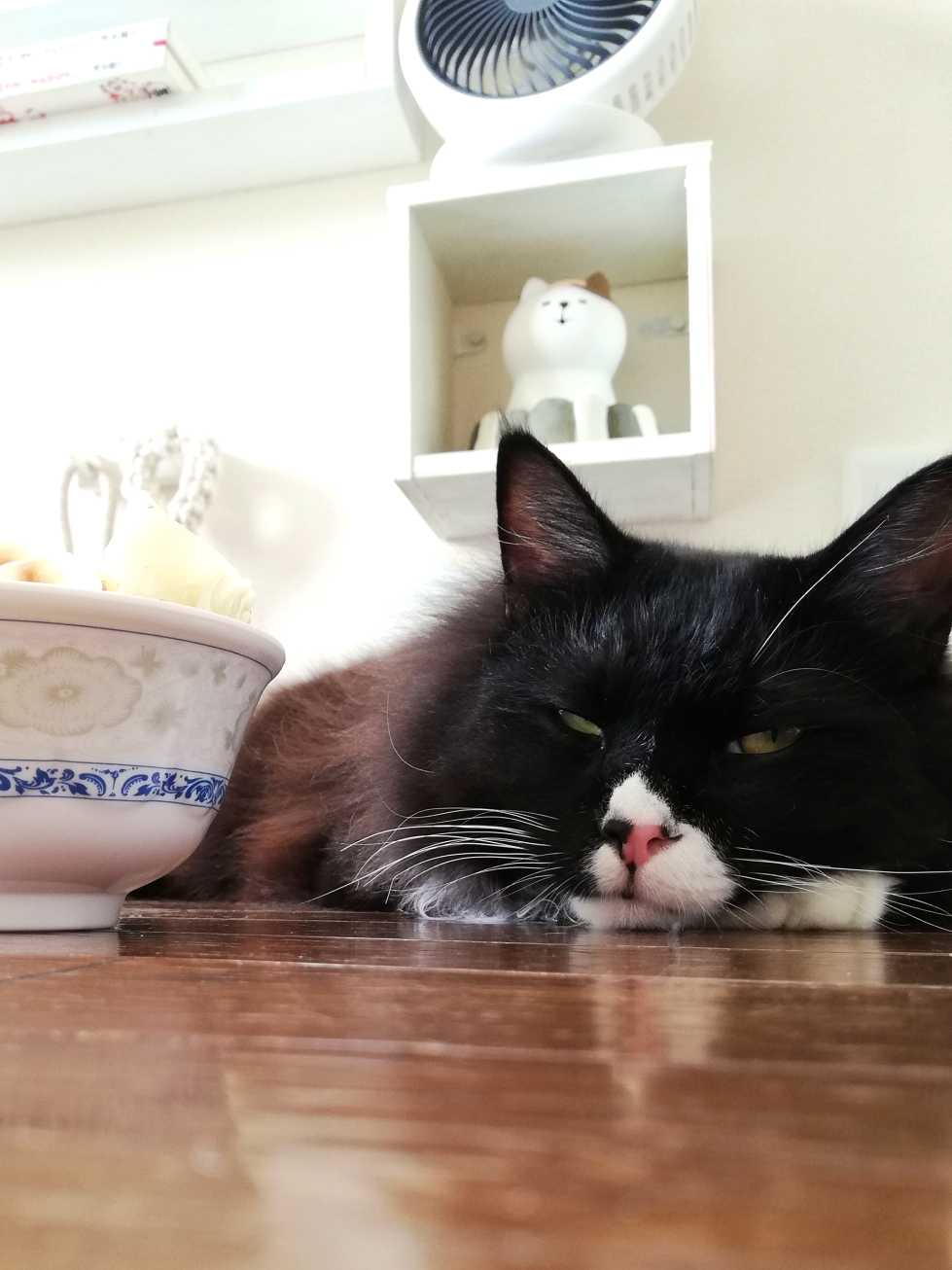 水餃子を見ながら寝そべるくーちゃん。