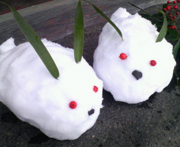 今朝起きて窓の外を見てみたら、そこには白い世界が広がっていました。・・・とうとうきたよ。本格的に雪が降る冬が。今日のは適度に水っぽい雪で、雪だるま制作に向きそう。作ってみようかと少し心が揺れましたが、寒すぎて断念しました。外にさえ出たくない・・・。でも、私はなんだかんだ言って毎年何かを作ってますね~。いい大人なのに(笑)。ここに過去作品を2つほど載せておきます。 ←雪うさぎ目は南天の実、耳は笹の葉で作るのが私流。やっつけ仕事なので形がやや崩れていますが、それもご愛嬌☆ ←ミニ雪だるまこれは友人達に写メールなどをしたところ、「可愛い!」と評判でした。この写真は哀愁漂ってますけども(笑)。他に作ったことがあるのは雪カピバラさん(フォルムが難しかった)、雪おにぎり(本物の海苔を使用したら、雪にはりつかなくて意外だった)くらいかな。不器用なのであまり凝ったものは作れないけど、童心にかえれて結構楽しいですよ。今年の冬はそんな余裕があるかな~。もし作ったら写真をUPするので、その時は褒めて下さい(笑)。