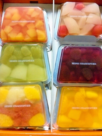 アンリ・シャルパンティエのテリーヌ・ドゥ・フリュイ。昨日夫が買ってきてくれました。といっても、私が頼んだんですけど(笑)。 見た目からしてすっごく綺麗ですよね~。生憎うちには素敵なガラス皿がないので、盛り付けた写真は載せられませんが。気になる人はこちら↓をクリックしてみて下さい。フランス料理でお馴染みのテリーヌに宝石のように色鮮やかなフルーツをとじこめました。ブラン...価格:2,700円(税込、送料別)今日私が選んだのはオレンジ&グレープフルーツ(勿体ないので1日1個ずつ食べる予定)。フルーツが贅沢にゴロゴロと入っていて美味しかったです。でも、コアントローの味はわからなかったなぁ。ほんの少し入っている程度なのかしら?他のを食べるのも楽しみです♪