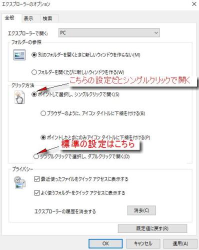 マウスのシングルクリックをあたかもダブルクリックしたような動作に設定することは出来るのですが、これは結構やっかいものです。例えば、ピクチャで写真をコントロールキーを押しならシングルクリックで選択すると複数の写真を選択することができます。ところがシングルクリックをダブルクリックの動作に設定していると、選択する段階で写真が開いてしまいます。この設定をしていた生徒さんが付いてこれなくなり見てあげると、「マウスのプロパティ」辺りの設定を戻せば解決するかと思いきや然に非ず。意外なところの設定をいじらないといけませんでした。Windows 10コントロールパネル↓デスクトップのカストマイズ↓エクスプローラーのオプション↓クリックの方法↓「シングルクリックを選択し、ダブルクリックで開く」が標準の設定エクスプローラーからも同様な設定ができます。エクスプローラー↓「表示」タブ↓オプション↓クリックの方法↓「シングルクリックを選択し、ダブルクリックで開く」が標準の設定