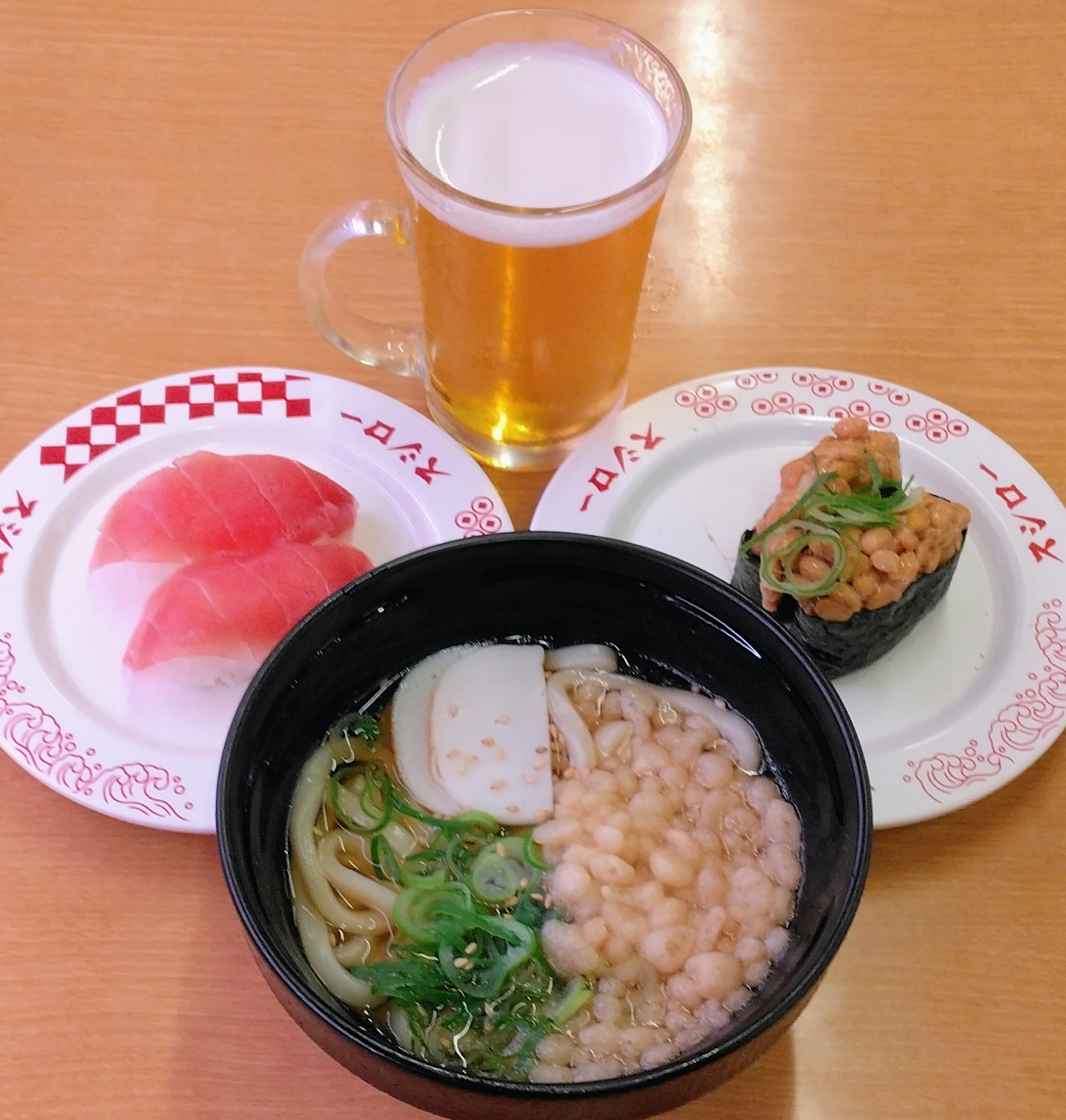スシロー! 1周目のオーダー! 生ビールグラス、440円! 小粒納豆軍艦、130円! 厳選まぐろ赤身、130円! かけうどん、190円! 2周目のオーダー! 角ハイボール、410円! 豚塩カルビ、150円! えび+たまご、130円! 〆さば(ごま・ネギ)、130円! 3周目のオーダー! バニラアイス紫芋ペーストがけ、160円! 数の子松前漬け軍艦、130円! コウイカ、150円! 厳選まぐろ赤身、130円! そいつぁよかった!