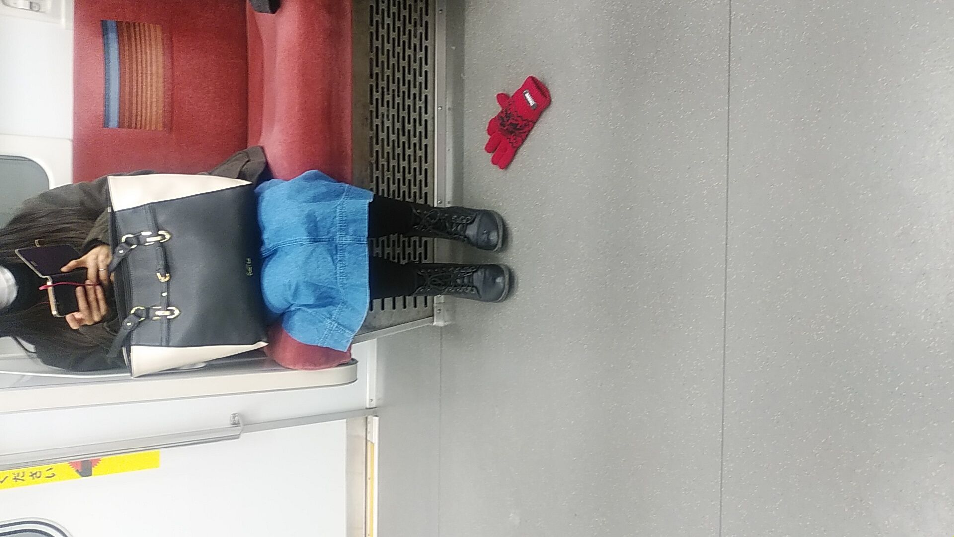 電車で写した写真の手袋は、座席に座っている女性の物ではありません!