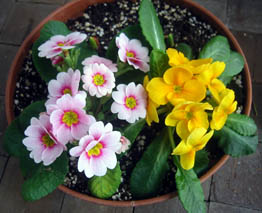 11/13のプリムラ、チューリップ、ムスカリの寄せ植え のプリムラが