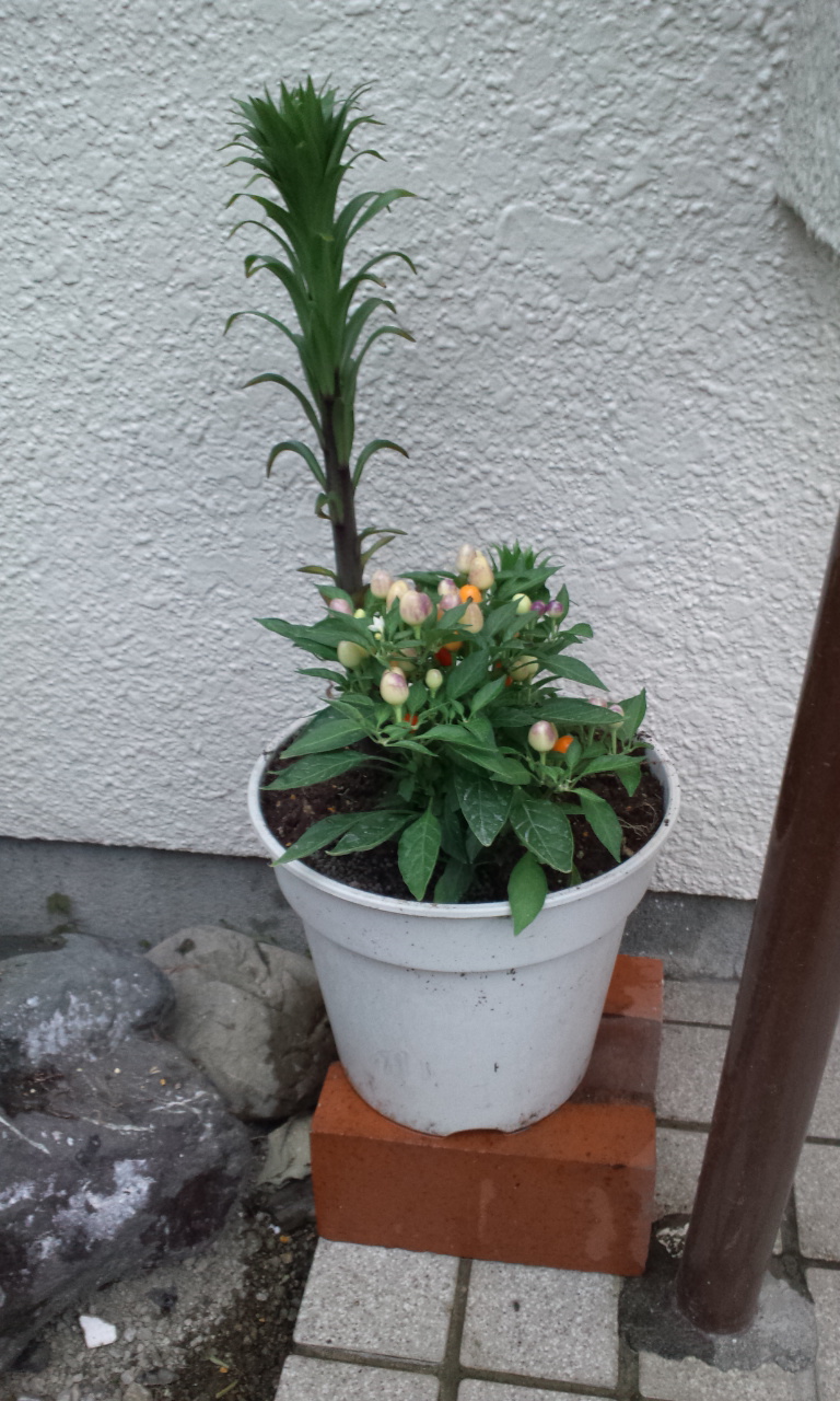 これから咲いてくれる、ユリ(白と紫一株ずつ)を