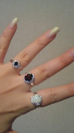一度にドン。左から、サファイア、ガーネットA、オパール。全部中指サイズだから、オパールは指に食い込んでるよ!ごめんね!あ・・・あれ?ガーネットも食い込んでるよーな・・?ガーネットは大粒で綺麗♪♪オパールと同じ台のようですが、輝きに深みがあってキラキラ過ぎないので私がつけてても偽モノには見えないような気も・・・これら、ショップ画像で見ると、「年齢層お高め?」って印象だったのですが、実際つけてみるとガーネットとオパールの台は成金ぽくはなくて気に入りました。周りはジルコだそうですが、小粒なのでキラキラし過ぎません。オパール、綺麗にシラーが入ってます。大きな白が指にあると心なしか動きが制限やはらかになるような気が。この2つは、マダム系というより、なんとなく醸す雰囲気は姫系って言ってもいいくらいじゃないかな?コロンとしてて可愛いです。サファイアは、見事に昔風の台ですが、石が小さいためデニムに合わせてます。ルビーは届いてすぐに母親のところに持っていってしまったので画像はないですが、これも可愛い赤ピンクでした。母親はびっくりしてとっても喜んでいたので、値段は言えず。(笑)親子、色違いお揃いです。裏はどれもとってもくりぬいてあるので、裏から見るのはナシよ。その分ガーネットなんかは光を取り込むのかちょっと傾けただけでキラキラ赤色がはじけます。可愛い。他にもマルチのサイドドリルネックレスとか色々届いてます。あんまりモリモリ過ぎて、もおどれがどれだか・・・また今度UPします。ヘアアクセと同じくらいのお値段で、天然石のリングが買えちゃうなんてビックリでした。このお値段だと、ヘアアクセとリンクさせたりできるのでうれしい。何が自分に似合って、どんな石がどんな雰囲気を醸すのかわからなくて勉強中の私には本当に良いお買い物でした。本気ジュエリーとは違う場所でバリバリ活躍してくれそうです。ひよこちゃん、キラつやさん、教えてくれてありがとうね!!