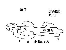 今日は休日。風邪を引いたので一日寝ていました。ゆるく熱が出て、咳とノドの腫れ、あとハナタレという一番大人らしくない風邪。たまに「ヘブウシ」という不発弾を無理やりつついたかのようなおかしなクシャミを連発。朝イチから、体温が高いためパッチリと目が覚めます。仕方ない(?)のでマンガを読みながら養生。私は廃人だ。もお、なんちゅうか、朝っぱらからマンガを読みながらゴロゴロするなんて、ごめん!ごめんね!でも、許して!昨日はフラフラでマスクしながら働いていたんですもの!(マスクって、鼻がふさがって口呼吸しなくちゃいけなくても、どうにか取り繕えるからステキなアイテムですね。最近気付きました。その代わり一度装着してしまったら、お外にいる間中はずせませんね。ファンデ溶けるから)薬を飲むために、朝ご飯をムリムリ食べてまた昼まで気を失ったように眠る。汗をかかないと治らないので、やたらと着込んで眠る。気がついたときには、こんな状態↓ キャット三階建て(断面図)口が開いているのは、鼻づまりで口呼吸しかできないためです。キャット総動員で私を暖めてくれたため、(というより、冬の厳しい冷え込みのなか、私で暖を取っていたのだと思われ)ガッチリ汗をかいてもう熱は下がりました。キャットたち・・・ありがとう。ありがとう。でも、上に乗られていたからか、おかしな筋肉痛・・・銀子4キロアンコ5キロ。こ・・・米袋・・・