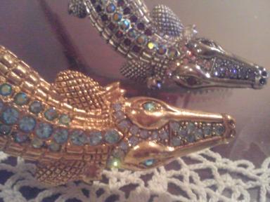 ワニさん届いてます。ガウーガウガウー!(←33歳)買ったのはコレやっぱりヴィオレッタさんは仕事がはやくて好き。昨日の朝にポチっとしたのに、次の日の昼には届くんだもん。G台水色ワニと一緒に、ついでに買っちゃったアメジストワニ。しかし、アメジストワニはなんというか、スジが通ってて良い。クールな風情で格好いいじゃないか。金×水色ワニは、可愛らしい色あわせでいながら、近づくとワニ!と周りをビックリさせる目的で買ったので、コンセプトが違う。名前をつけた。水色の方がワニ王。紫はワニ帝。(ホントに33歳なんです。アホだけど)なんだか顔がついてるので愛着がわいてしまって、ガウーガオガオーと戦わせたりしているので、落して壊してしまったら、なんてもう今から心配。これ、はまる人の気持ちわかります。私、頭大きいからこの大きさで十分許容範囲。はさみ心地も悪くないです。思ったより軽かった。それ以外にはバッグにつけたりストールにつけたり。今、ヴィオレッタさんのワニは売り切れましたが、LMさんにはワニがいっぱいセール中。シルバーとか金古美とか。欲しいかもー。ガウガウー。