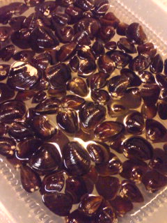 今日も梅雨らしい、雨が降ったり止んだりのお天気。まだ、痛み止めを飲まないと歯が痛くって、テンション低めで過ごしていた私です。リンパもまだちょっと腫れています。早く治ってくれるといいのですけれど。昨日のことですが。私がクーの撮影大会をして遊んでいる間、だんな様は狩猟に行っていました。そして、夜遅く、おみやげをもって帰宅。しじみと手長エビ8匹。都内某所でとれた天然物。しじみも手長エビも、砂出し?を1~2日してから食用にするそうです。おいしく食べられるのか?果たして調理はどうするのか?しじみはお店でしか買ったことがないし、手長エビなんてフレンチのお店で一度食べたことがあるかどうか…。だんな様の狩猟のおかげで、最近、食卓がにぎわっている我が家です。
